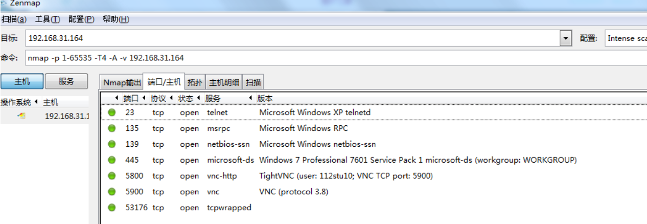 选择一个存活IP地址,扫描所开放的端口(分别用ping扫描,syn扫描尝试和全连接扫描),并查询常用端口所对应的服务及操作系统信息。