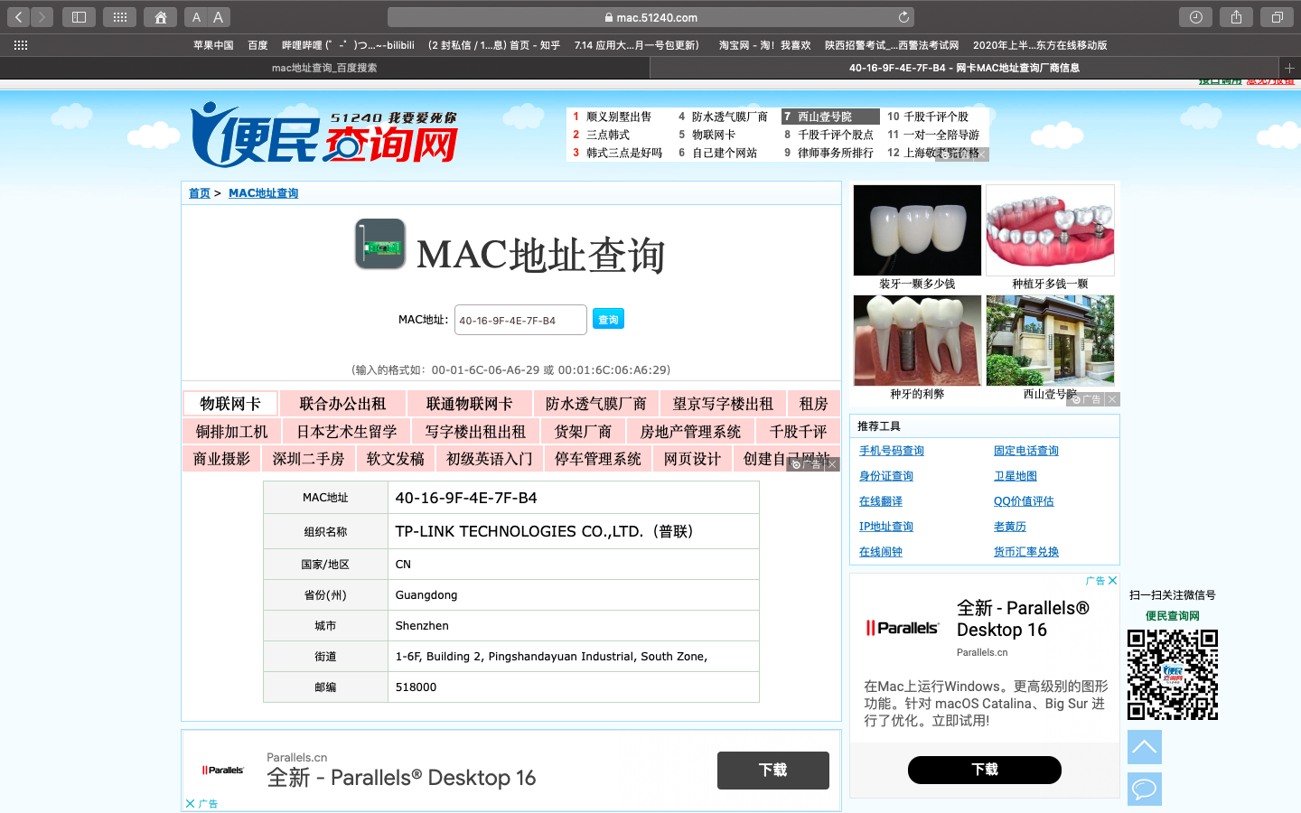 在一个案件中,获取了犯罪嫌疑人的一个MAC地址:40-16-9F-4E-7F-B4,请查询该MAC地址对应的厂商是(附截图)