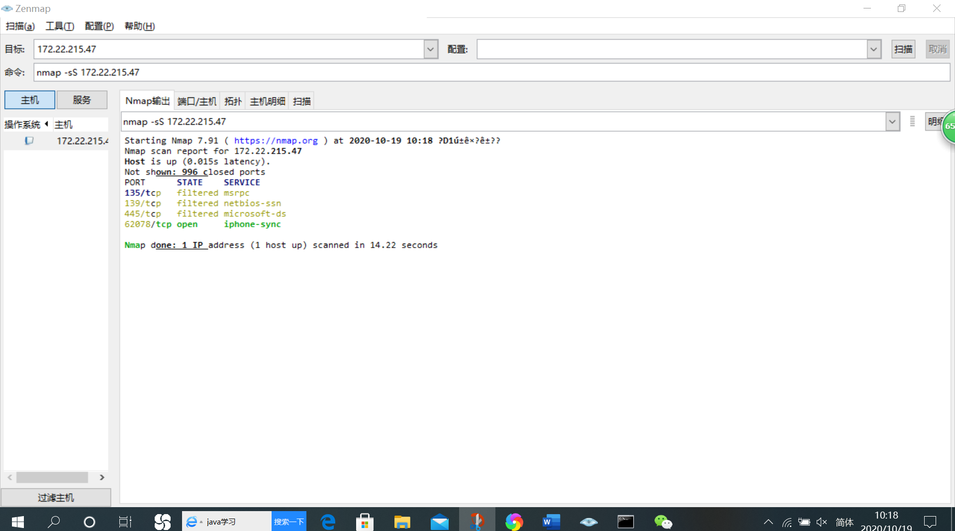 选择一个存活IP地址,扫描所开放的端口(分别用ping扫描,syn扫描尝试和全连接扫描),并查询常用端口所对应的服务及操作系统信息。