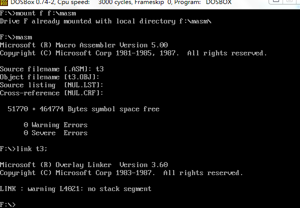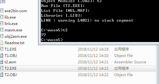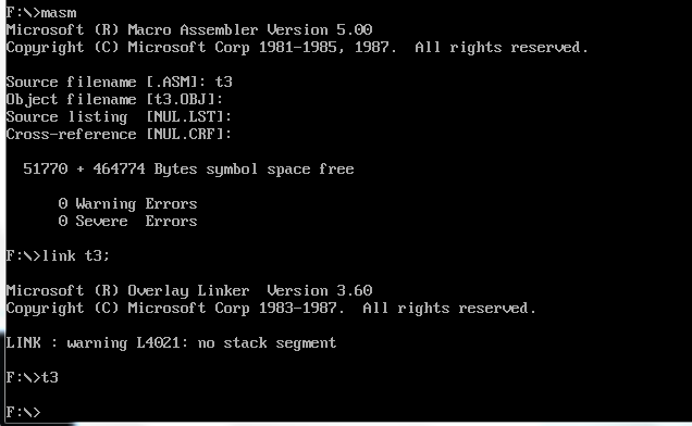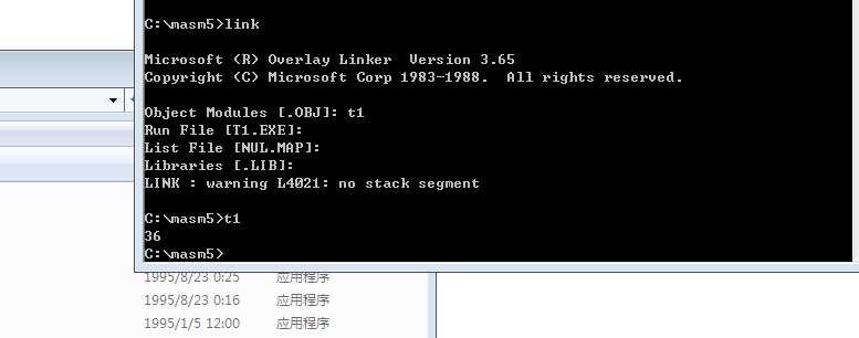 这次的实验练习了使用MASM工具对.asm文件的编译、链接与运行,其中在编译和link时可以在文件名后加分号的形式略过中间的步骤。练习一中对line和line9的数据进行修改,结果分别对应十位数和个位数;实验二因为操作环境的缘故(也许?)要清屏后重新运行才能达到预期效果,但是颜色的变更理由不甚清楚。。。感觉应该是开头数字由4变成3,对应从红色变成蓝色(第一位数字对应一种颜色?)