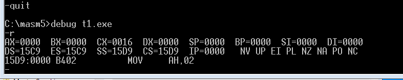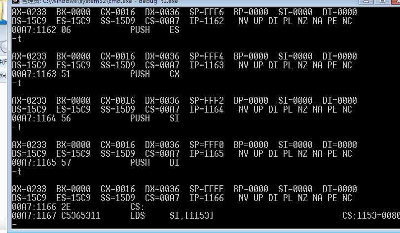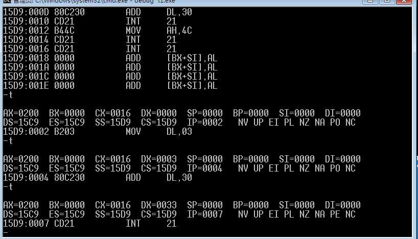 使用t命令和p命令单步调试,遇到int时使用p命令: