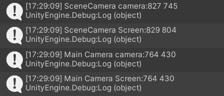 Screen.width和Screen.height在Scene中获取的是窗口的大小,不是屏幕的大小(屏幕包含在窗口中,窗口还有部分区域用于绘制GUI),获取屏幕的大小需要用camera.pixelWidth和camera.pixelHeight,而在Game中没有这种问题,两类获取的结果一样。