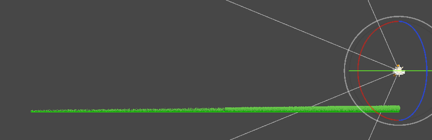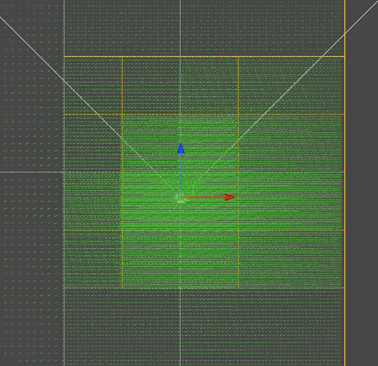 红线是剔除边界,比视锥略大,因为我们没有草片的AABB,而草片位置会随机偏移,所以预留一些空间确保草片不会突然出现在视线内,仅通过视锥剔除就能够剔除30%到40%的草(粗略估计,因为剔除只是减少GS和FS,顶点并没有减少不好统计少了多少,后续可能会统计一下)。