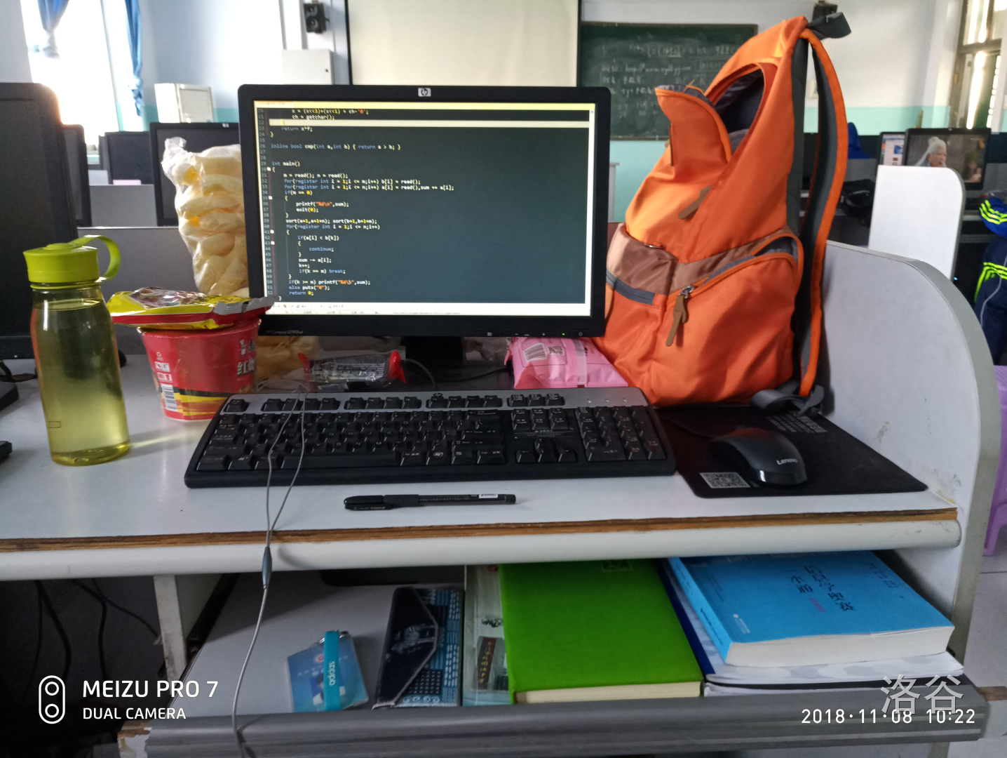 之后根据老师的安排,每周末下午返校前去机房培训一个下午,然后平常抽空去机房写题。不过好日子并没有过多久,我就遇上了我学\(OI\)路上最大的阻碍之一,班主任\(L\)老师。起初\(L\)老师并没有把我学\(OI\)当成一会事,后来发现我经常跷自习课,就开始对我百般阻挠,说我没写完作业不能去机房,我就每天下课和午休的时间赶作业,就是为了能换一节自习课去机房,后来\(L\)老师发现我作业都能完成,就开始以我成绩差为由不让我去机房。我当时非常的不理解,做出一些对抗,换来的自然就是各种批评,叫家长,停课等种种惩罚。最后不得不屈服,也算是达成了一个协定吧,自习课不能去机房,周末的培训可以去,并且文化课不能落下。从此我也算是踏上了一条不归路吧,在班的时候拼命的学习,每天下午吃饭的时间,不吃饭跑到机房利用不足三十分钟的时间实现代码调试。从此我也养成了一个坏习惯,下午不吃晚饭。呢段时间感觉自己过得非常非常充实。不知不觉就到了期末,此时的我\(OI\)水平还保持在机房最高,同时文化课也从班级倒数第三,年级140+,提升到班级第四,年级十四名。就这样结束了我的高一上学期。