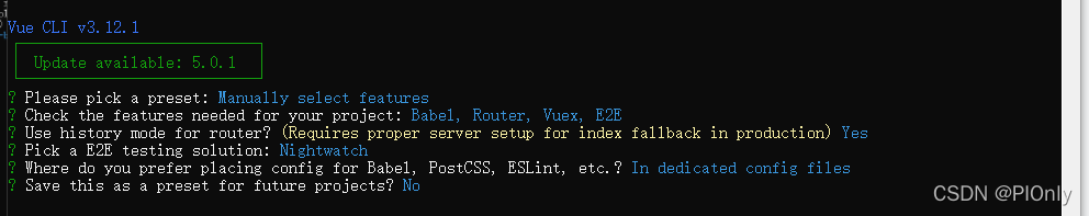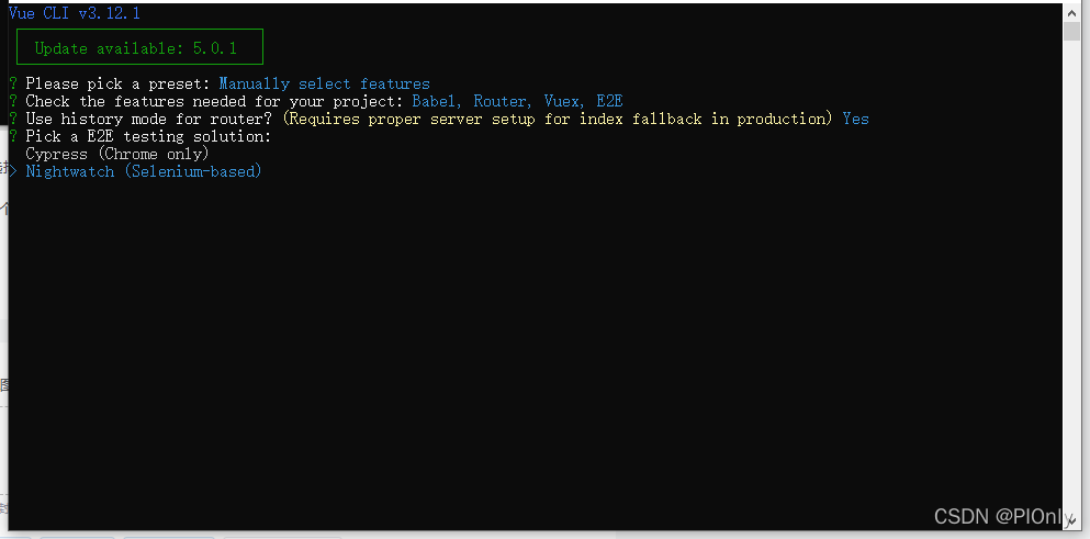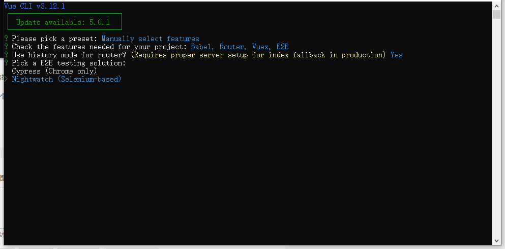 首先通过@vue/cli创建一个基于nightwatch的测试项目。(我这里使用的是@vue/cli 3.x的版本)