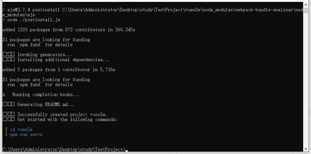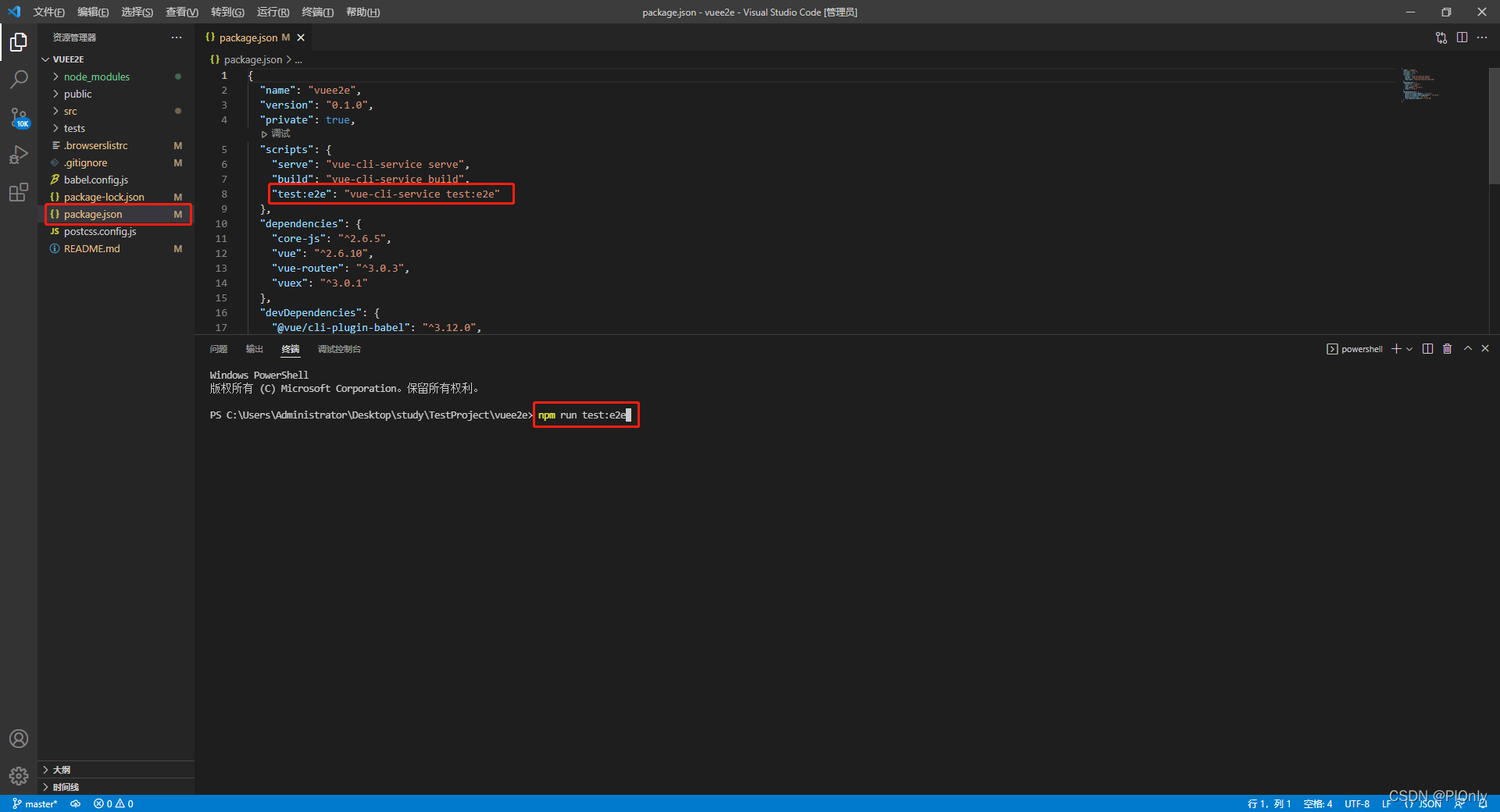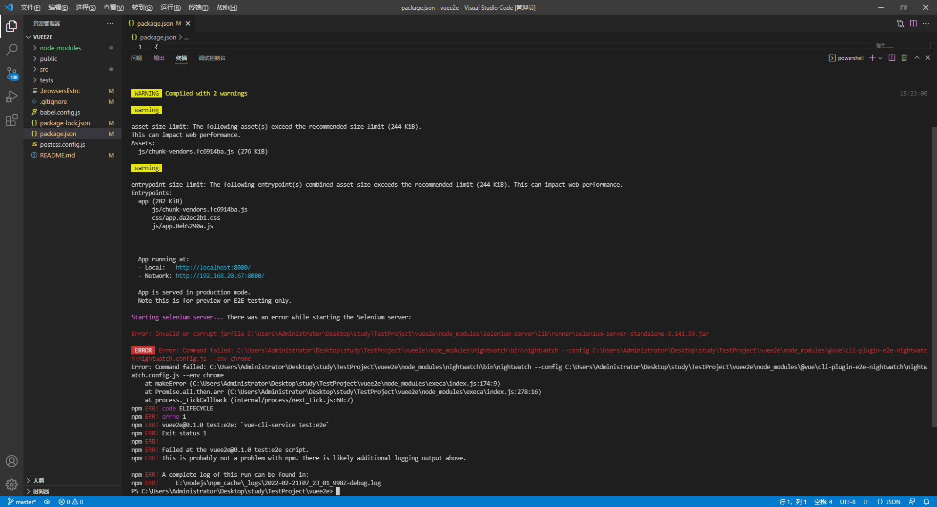 打开刚刚创建好的项目,首先测试下刚创建的项目能否直接进行e2e测试,在终端里输入 package.json配置文件里设定的测试命令:npm run test:e2e。然后回车