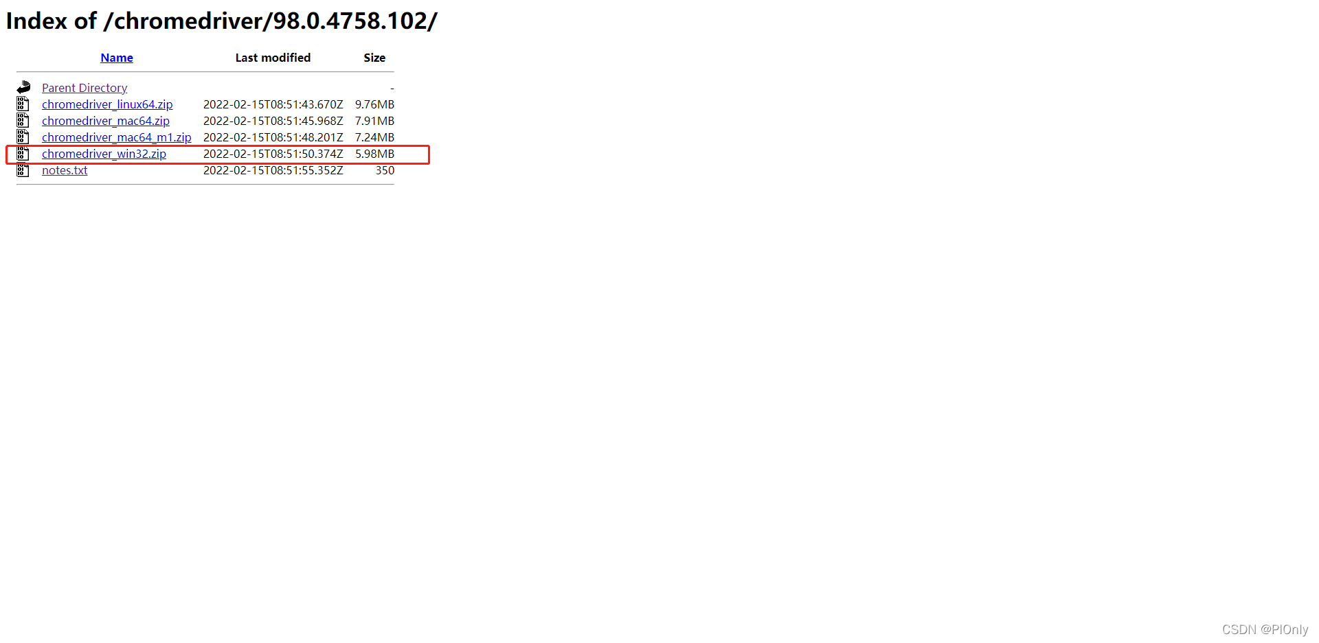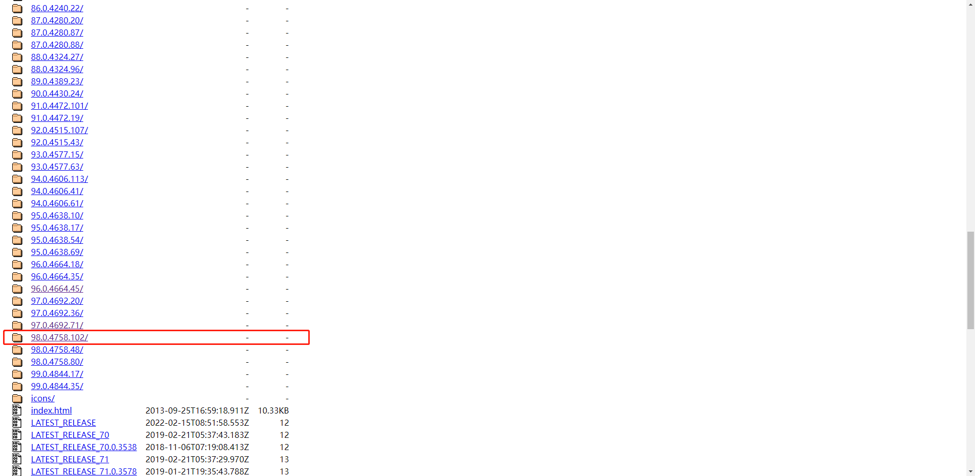 找到与我们浏览器版本相一致的文件点击下载(可通过notes.txt文件查看chromedriver所对应chrome版本),下载完成后将下载的压缩包解压改名后放在node_modules/_chromedriver@98.0.1@chromedriver/lib路径下