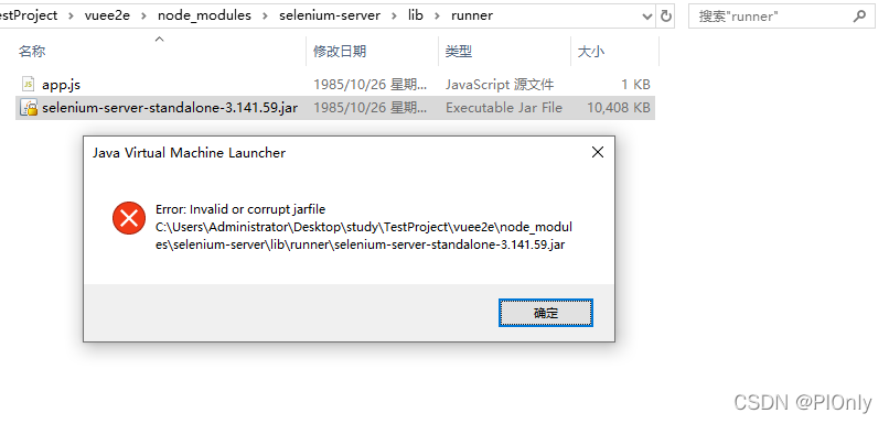 结果还是报错了,根据错误日志,我们查看node_modules/selenium-server/lib/runner路径下的selenium-server-standalone-3.141.59.jar是否存在及正常。