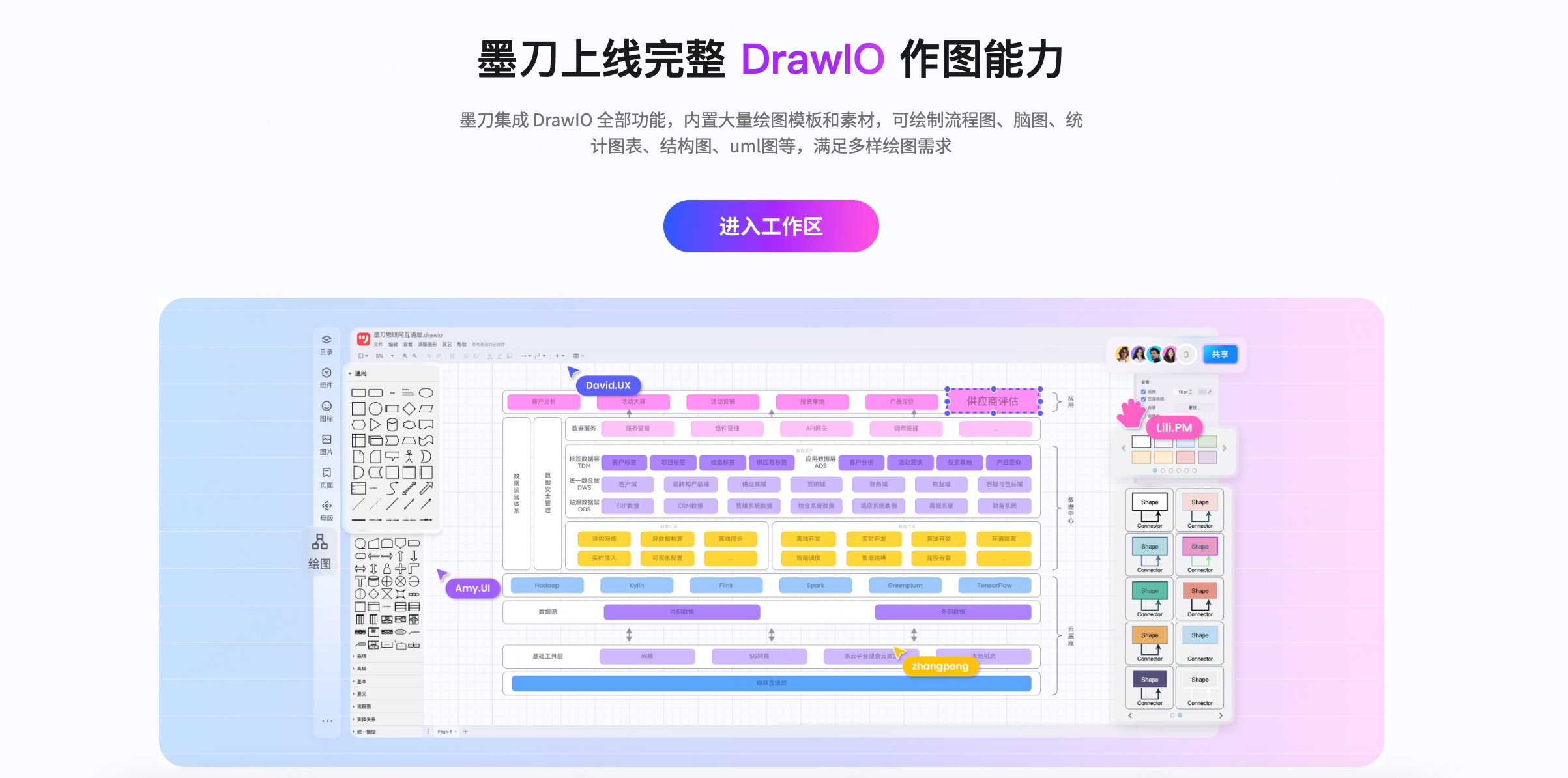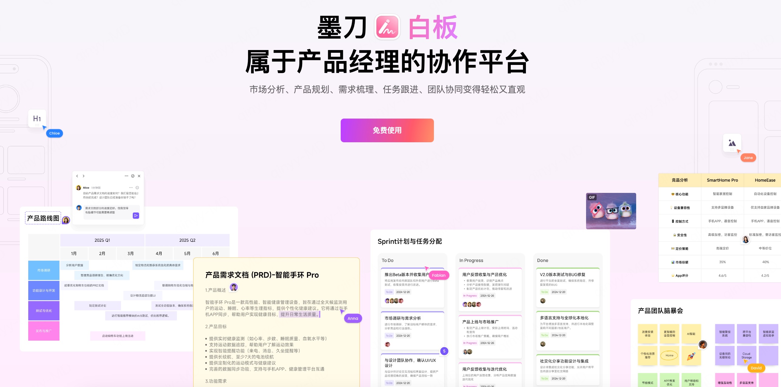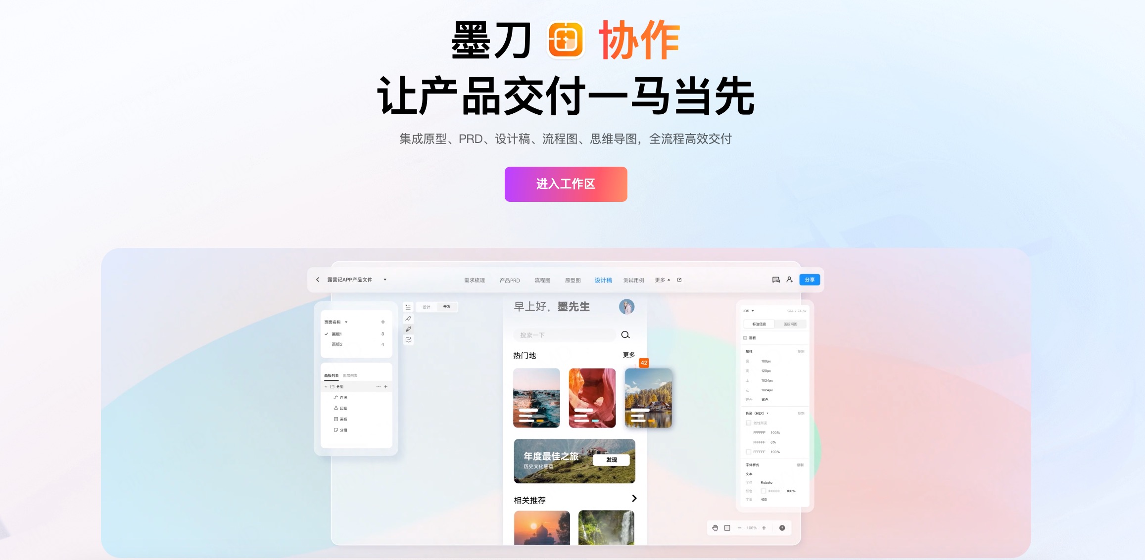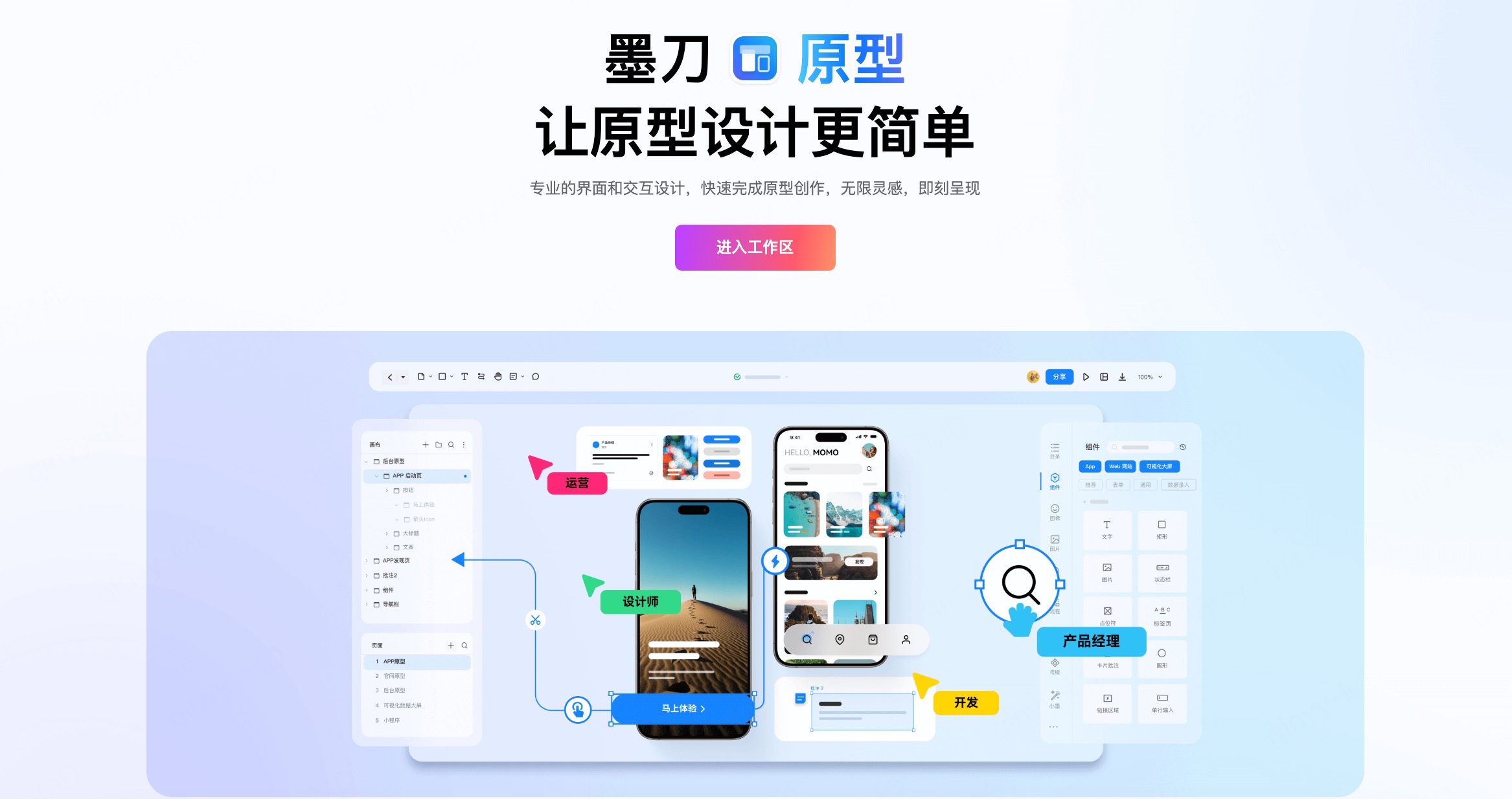 作为国产原型设计工具的代表,墨刀兼具白板、原型、绘图、协作一站式服务,覆盖产品经理工作流程中需要的核心工具需求。