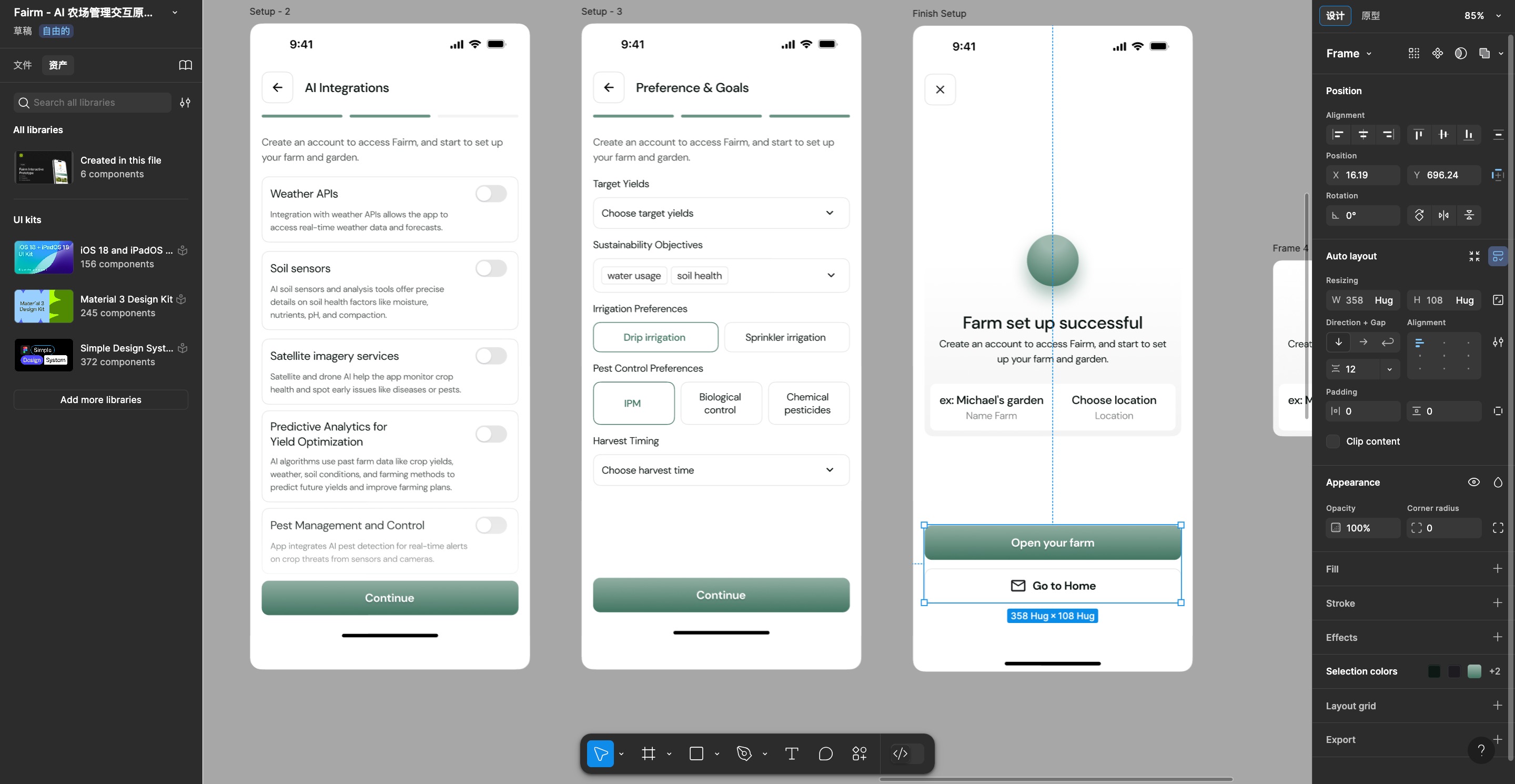 - 组件图标:制作同一款APP原型时,我们发现Figma在组件和图标的使用上依赖社区资源和UIkit,需要手动搜索和安装;墨刀内置常见的页面、组件和图标库,无需在其他平台寻找素材。