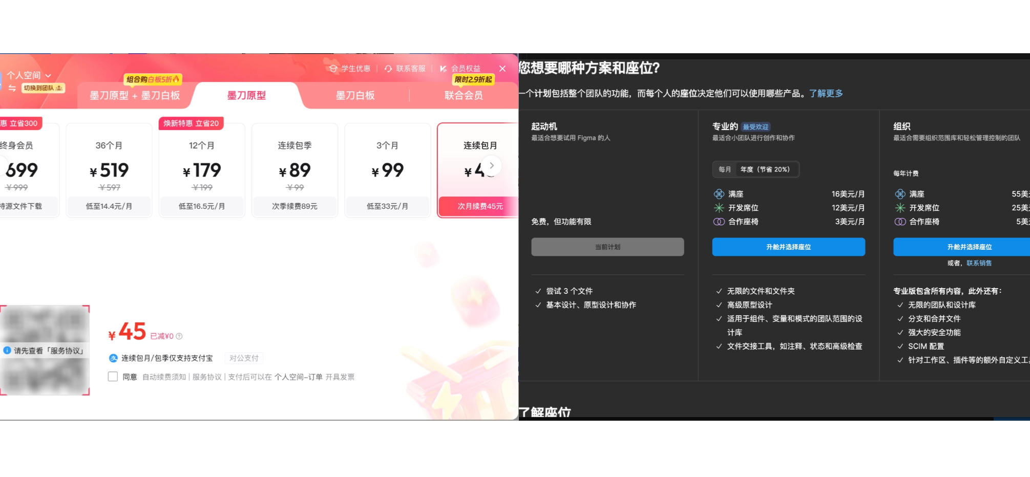 两款工具都有免费版,墨刀和Figma的免费版都限制3个文件,目的是让对产品感兴趣的人先上手试用。如今是工具付费时代,性价比也是影响选择的因素之一。如下图两款工具的定价,相比之下墨刀付费成本更低,提供比较贴合不同类型产品经理需求的定价梯度;Figma的成本更高一些,另外国内产品的本地化服务较为优质,海外工具在产品客服服务上很难提供保障。