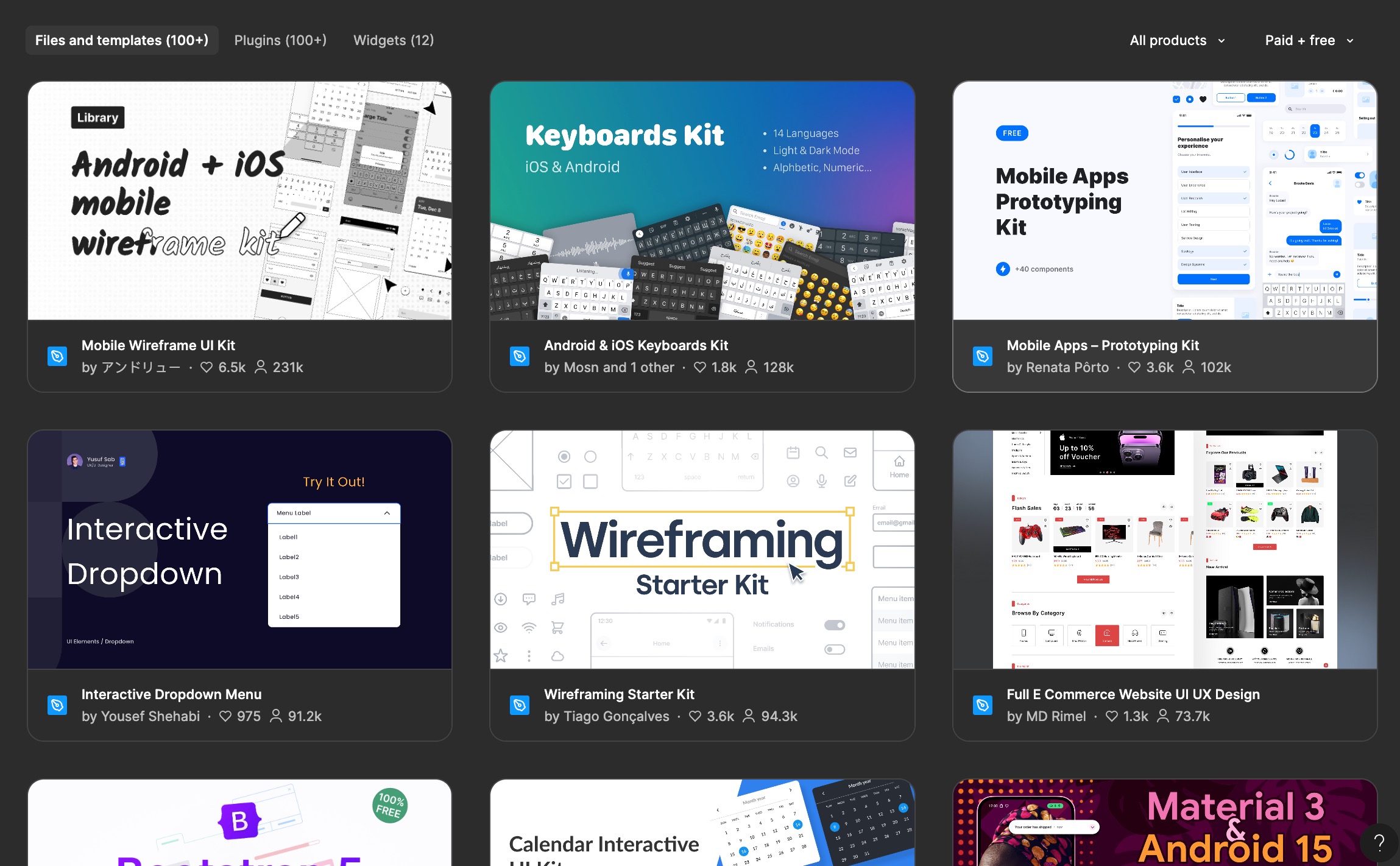 在原型文件这一块,尤其是APP原型和Web网页原型资源相对丰富,有低保真线框图还有一些视觉效果很好的高保真原型图,在这里产品经理不仅可以寻找合适的模板资源,还可以学习一些视觉上的设计效果,这对制作高保真原型图需求的PM来说是有很大价值的。除了原型文件,你还能获取丰富的插件和共享组件,加速团队协作和设计输出。