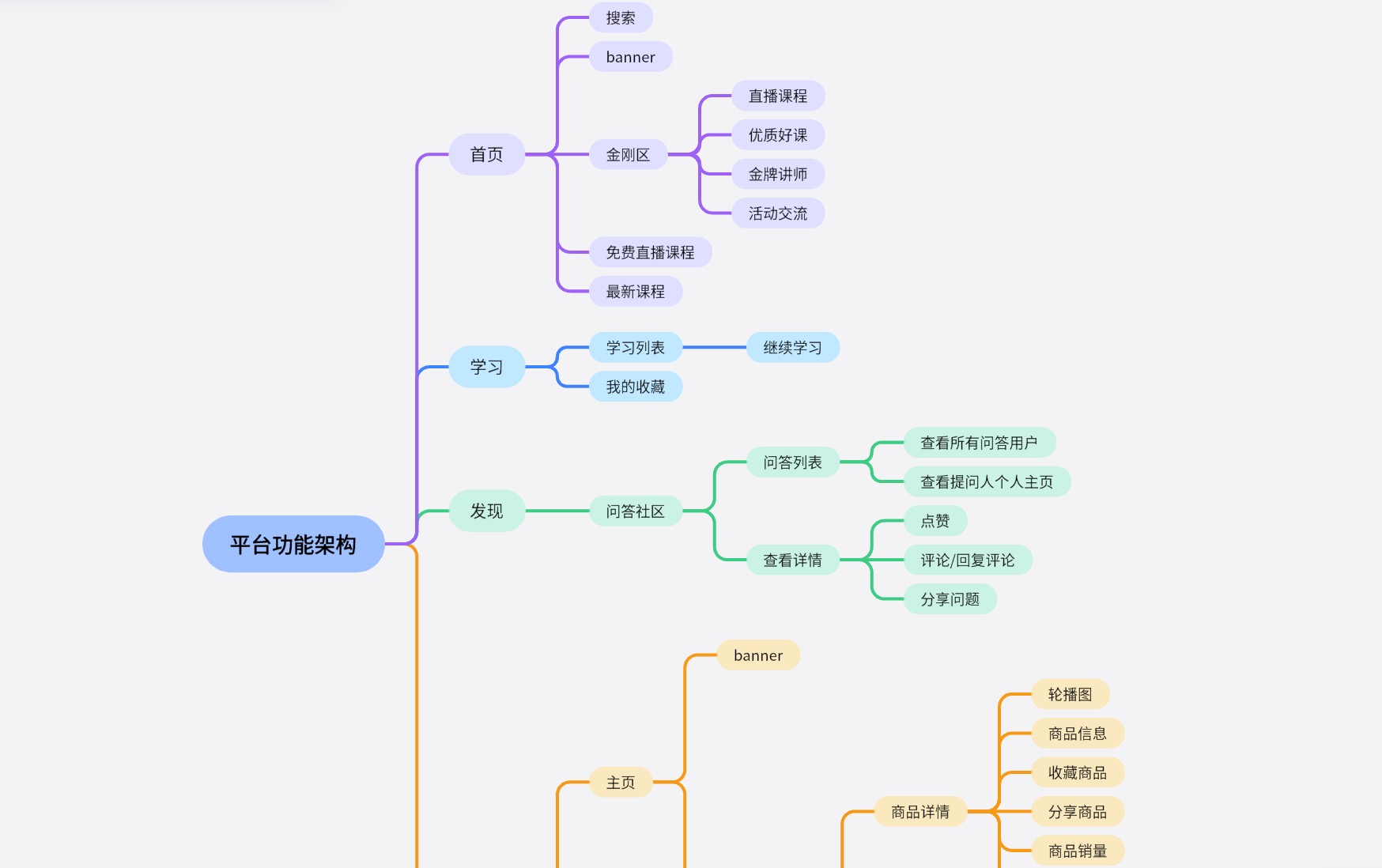 在进行市场分析后挖掘出用户痛点,需要将用户需求转化为具体的功能点,构建产品信息架构。此步骤建议使用流程图和功能结构图辅助思考,通过上述举例的AI工具,帮助产品经理快速制作功能架构图(如下图为一款在线教育APP的功能架构图),为产品原型设计打下基础。