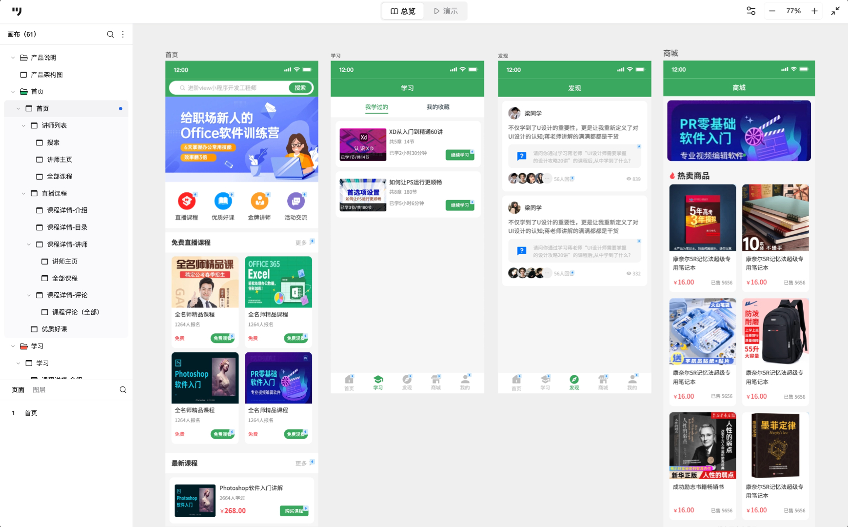 高效的原型设计工具可以达到事半功倍的效果。满足在线教育APP的原型设计工具有很多,建议使用轻量高效的工具。这里举例如下:
