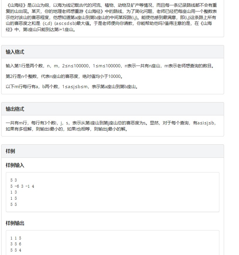 1 #include <bits/stdc++.h> 2 using namespace std; 3 struct tree{ 4 int id,l,r; 5 int sum,ls,rs,s; 6 int ll,rr,lt,rt; 7 }a[500000]; 8 int b[100005]; 9 void build(int id,int l,int r) 10 { 11 a[id].l=l;a[id].r=r; 12 if(l==r) 13 { 14 a[id].s=a[id].sum=a[id].ls=a[id].rs=b[l]; 15 a[id].ll=a[id].rr=a[id].rt=a[id].lt=l; 16 return; 17 } 18 int mid=(l+r)/2; 19 build(id*2,l,mid);build(id*2+1,mid+1,r); 20 a[id].ls=max(a[id*2].ls,a[id*2].sum+a[id*2+1].ls); 21 if(a[id].ls==a[id*2].sum+a[id*2+1].ls)a[id].lt=a[id*2+1].lt; 22 if(a[id].ls==a[id*2].ls)a[id].lt=a[id*2].lt; 23 a[id].rs=max(a[id*2+1].rs,a[id*2+1].sum+a[id*2].rs); 24 if(a[id].rs==a[id*2+1].rs)a[id].rt=a[id*2+1].rt; 25 if(a[id].rs==a[id*2+1].sum+a[id*2].rs)a[id].rt=a[id*2].rt; 26 a[id].sum=a[id*2].sum+a[id*2+1].sum; 27 a[id].s=max(max(a[id*2].s,a[id*2+1].s),a[id*2].rs+a[id*2+1].ls); 28 int sb=0; 29 if(a[id].s==a[id*2+1].s) 30 { 31 a[id].rr=a[id*2+1].rr;a[id].ll=a[id*2+1].ll; 32 sb=1; 33 } 34 if(a[id].s==a[id*2+1].ls+a[id*2].rs) 35 { 36 if((!sb)||a[id].ll>a[id*2].rt||(a[id].ll==a[id*2].rt&&a[id].rr>a[id].lt)) 37 a[id].ll=a[id*2].rt,a[id].rr=a[id*2+1].lt,sb=1; 38 } 39 if(a[id].s==a[id*2].s) 40 { 41 if((!sb)||a[id].ll>a[id*2].ll||(a[id].ll==a[id*2].ll&&a[id].rr>a[id*2].rr)) 42 a[id].rr=a[id*2].rr,a[id].ll=a[id*2].ll,sb=1; 43 } 44 } 45 inline tree cha(int id,int l,int r) 46 { 47 tree p; 48 if(a[id].l==l&&a[id].r==r) 49 { 50 p.l=a[id].l;p.r=a[id].r;p.s=a[id].s; 51 p.sum=a[id].sum;p.ls=a[id].ls;p.rs=a[id].rs; 52 p.lt=a[id].lt;p.rt=a[id].rt; 53 p.ll=a[id].ll;p.rr=a[id].rr; 54 return p; 55 } 56 int mid=(a[id].l+a[id].r)/2; 57 if(r<=mid)return cha(id*2,l,r); 58 if(l>mid)return cha(id*2+1,l,r); 59 tree x=cha(id*2,l,mid),y=cha(id*2+1,mid+1,r); 60 p.ls=max(x.ls,x.sum+y.ls); 61 if(p.ls==x.sum+y.ls)p.lt=y.lt; 62 if(p.ls==x.ls)p.lt=x.lt; 63 p.rs=max(y.rs,y.sum+x.rs); 64 if(p.rs==y.rs)p.rt=y.rt; 65 if(p.rs==y.sum+x.rs)p.rt=x.rt; 66 p.sum=x.sum+y.sum; 67 p.s=max(max(x.s,y.s),x.rs+y.ls); 68 int sb=0; 69 if(p.s==y.s) 70 { 71 p.rr=y.rr;p.ll=y.ll; 72 sb=1; 73 } 74 if(p.s==y.ls+x.rs) 75 { 76 if((!sb)||p.ll>x.rt||(p.ll==x.rt&&p.rr>y.rt)) 77 p.ll=x.rt,p.rr=y.lt,sb=1; 78 } 79 if(p.s==x.s) 80 { 81 if((!sb)||p.ll>x.ll||(p.ll==x.ll&&p.rr>x.rr)) 82 p.rr=x.rr,p.ll=x.ll,sb=1; 83 } 84 return p; 85 } 86 int main() 87 { 88 int n,m; 89 cin>>n>>m; 90 for(int i=1;i<=n;i++) 91 scanf("%d",&b[i]); 92 build(1,1,n); 93 for(int i=1;i<=m;i++) 94 { 95 int l,r; 96 scanf("%d%d",&l,&r); 97 tree p=cha(1,l,r); 98 printf("%d %d %d\n",p.ll,p.rr,p.s); 99 } 100 return 0; 101 }