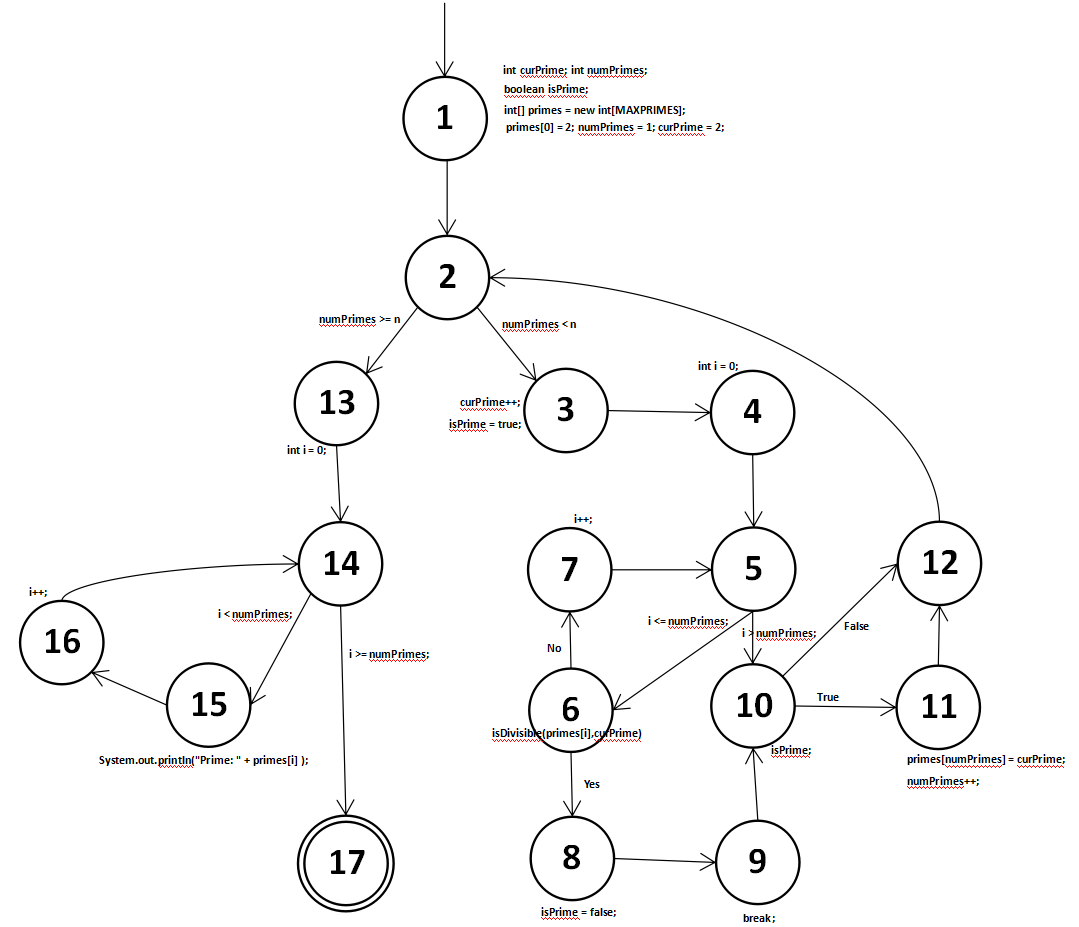 (d) Enumerate the test requirements for node coverage, edge coverage,and prime path coverage for the path for printPrimes().
