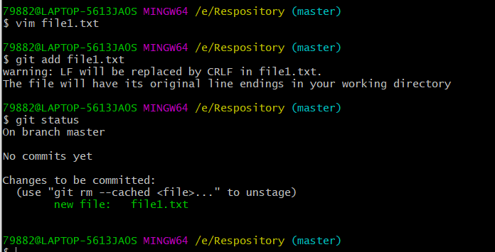 创建并编辑了文件file1 并使用git add指令将其添加到了暂存区,此时我们再使用git status看下当前状态,可发现状态已经发生变化,已经检测到有待提交文件