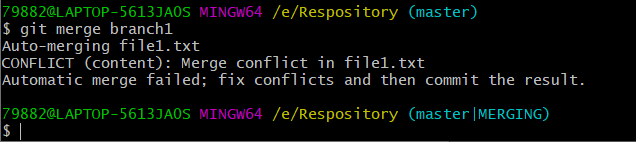 若有以下场景:在branch1以及master分支上都修改了文件file1.txt并进行了添加提交操作,此时使用git merge指令进行合并时,会产生冲突。