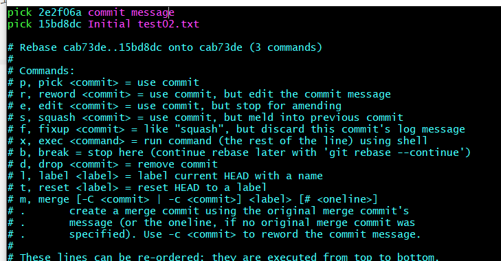 关于 git rebase指令的使用,我们使用git rebase -i进入commit整理页面,可以看到在这个页面中我删除了“The first revise test01.txt”的修改记录