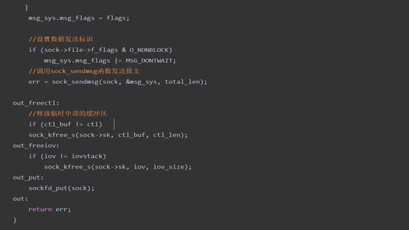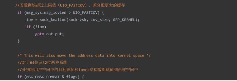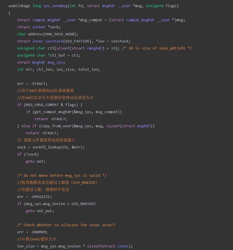 我们发现在sys_sendto函数种最终还是通过调用SYS_SENDMSG函数进行发送数据,所以我们接着对SYS_SENDMSG函数做分析。该函数的主要工作是将用户空间的信息复制到内核空间中,然后再逐级调用发包接口发送数据。具体到源码的解析如下: