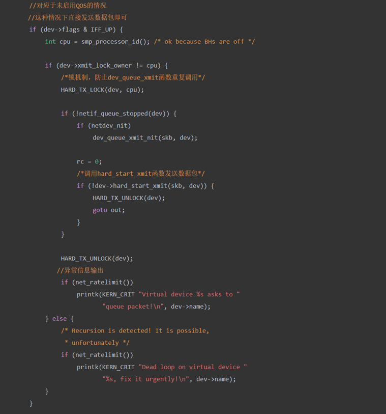 启用软中断后,调用dev_queue_xmit函数对数据包进行处理,主要处理依据为是否采用了Generic Segmentation Offload技术,是否采用了QoS技术进行处理。对函数dev_queue_xmit的源码分析如下: