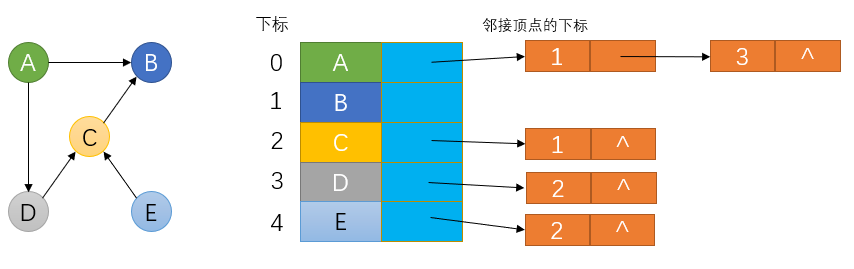 有向图右边的链表只存储出度部分。比如顶点C,C的出度只有一条,指向B,所以C仅仅指向了一个。