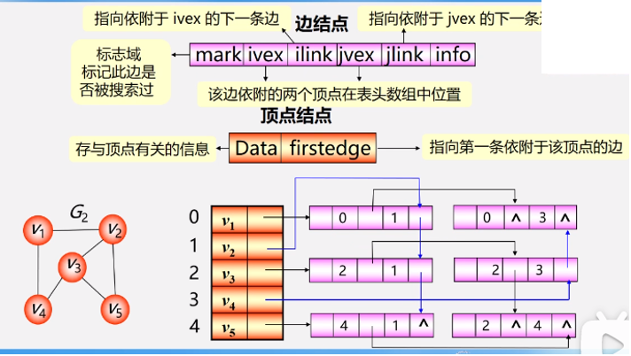 对于无向图而言,很明显可以发现每两条边都要存储两边,比较浪费内存,且增删边操作都挺难的,所以我们采用邻接多重表解决。邻接多重表如下: