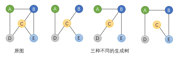 - 生成树:所有顶点均由边连接在一起,但不存在回路的图。如: