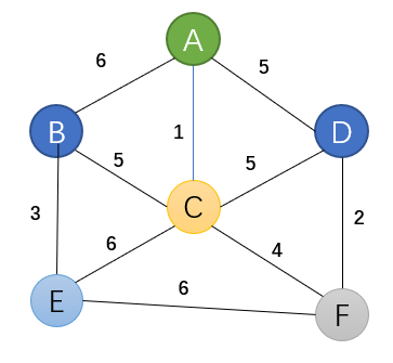 首先让U集合包含A顶点在结合内,V-U集合包含B,C,D,E,F,此时U与V-U集合相连的边权值分别为6,1,5,选择权值最小的1,然后将C纳入U集合,此时U集合包含A,C,V-U集合包含B,D,E,F,此时U与V-U集合相连的边权值分别为6,5,5,5,6,4,选择权值最小的4,然后将F纳如U集合,V-U集合包含B,D,E,依次类推,直至所有顶点都被访问一遍。