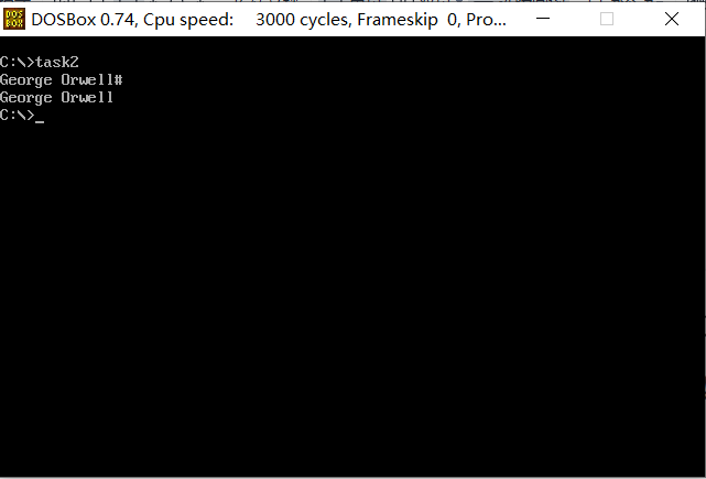 assume cs:code, ds:data data segment str db 80 dup(?) data ends code segment start: mov ax, data mov ds, ax mov si, 0 s1: mov ah, 1 int 21h mov [si], al cmp al, '#' je next inc si jmp s1 next: mov ah, 2 mov dl, 0ah int 21h mov cx, si mov si, 0 s2: mov ah, 2 mov dl, [si] int 21h inc si loop s2 mov ah, 4ch int 21h code ends end start