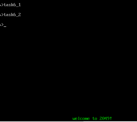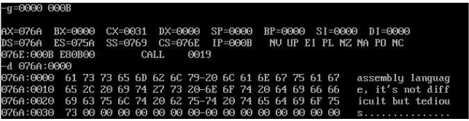 assume cs:code code segment start: ; 42 interrupt routine install code mov ax, cs mov ds, ax mov si, offset int42 ; set ds:si mov ax, 0 mov es, ax mov di, 200h ; set es:di mov cx, offset int42_end - offset int42 cld rep movsb ; set IVT(Interrupt Vector Table) mov ax, 0 mov es, ax mov word ptr es:[42*4], 200h mov word ptr es:[42*4+2], 0 mov ah, 4ch int 21h int42: jmp short int42_start str db "welcome to 2049!" len equ $ - str ; display string "welcome to 2049!" int42_start: mov ax, cs mov ds, ax mov si, 202h mov ax, 0b800h mov es, ax mov di, 24*160 + 32*2 mov cx, len s: mov al, [si] mov es:[di], al mov byte ptr es:[di+1], 2 inc si add di, 2 loop s iret int42_end: nop code ends end start