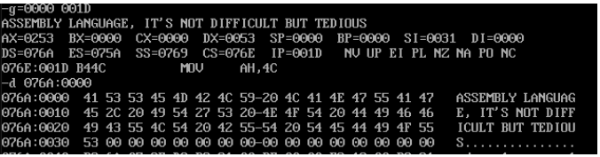 assume cs:code, ds:data data segment str db "assembly language, it's not difficult but tedious" len equ $ - str data ends code segment start: mov ax, data mov ds, ax mov cx, len mov si, 0 s: call strupr mov cx, len mov si, 0 mov ah, 2 printStr: mov dl, ds:[si] int 21h inc si loop printStr mov ah, 4ch int 21h strupr: mov al, byte ptr ds:[si] cmp al, 'a' jb s0 cmp al, 'z' ja s0 sub al, 20h mov ds:[si], al s0: inc si loop strupr ret code ends end start