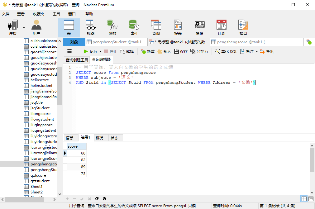 -- 用子查询,查来自安徽的学生的语文成绩 SELECT score From pengshengscore WHERE subjects = '语文' AND Stuid in (SELECT Stuid FROM pengshengStudent WHERE Address = '安徽')
