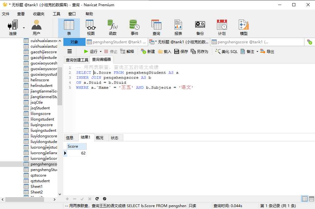 -- 用两表联查,查询王五的语文成绩 SELECT b.Score FROM pengshengStudent AS a INNER JOIN pengshengscore AS b ON a.Stuid = b.Stuid WHERE a.`Name` = '王五' AND b.Subjects = '语文'