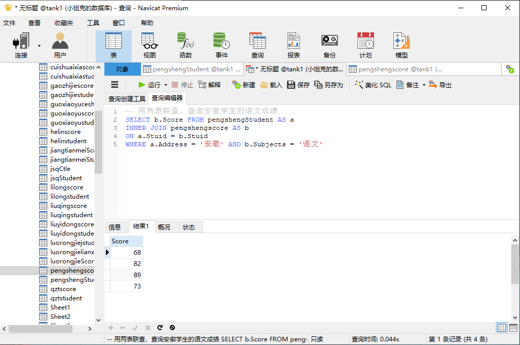 -- 用两表联查,查询安徽学生的语文成绩 SELECT b.Score FROM pengshengStudent AS a INNER JOIN pengshengscore AS b ON a.Stuid = b.Stuid WHERE a.Address = '安徽' AND b.Subjects = '语文'