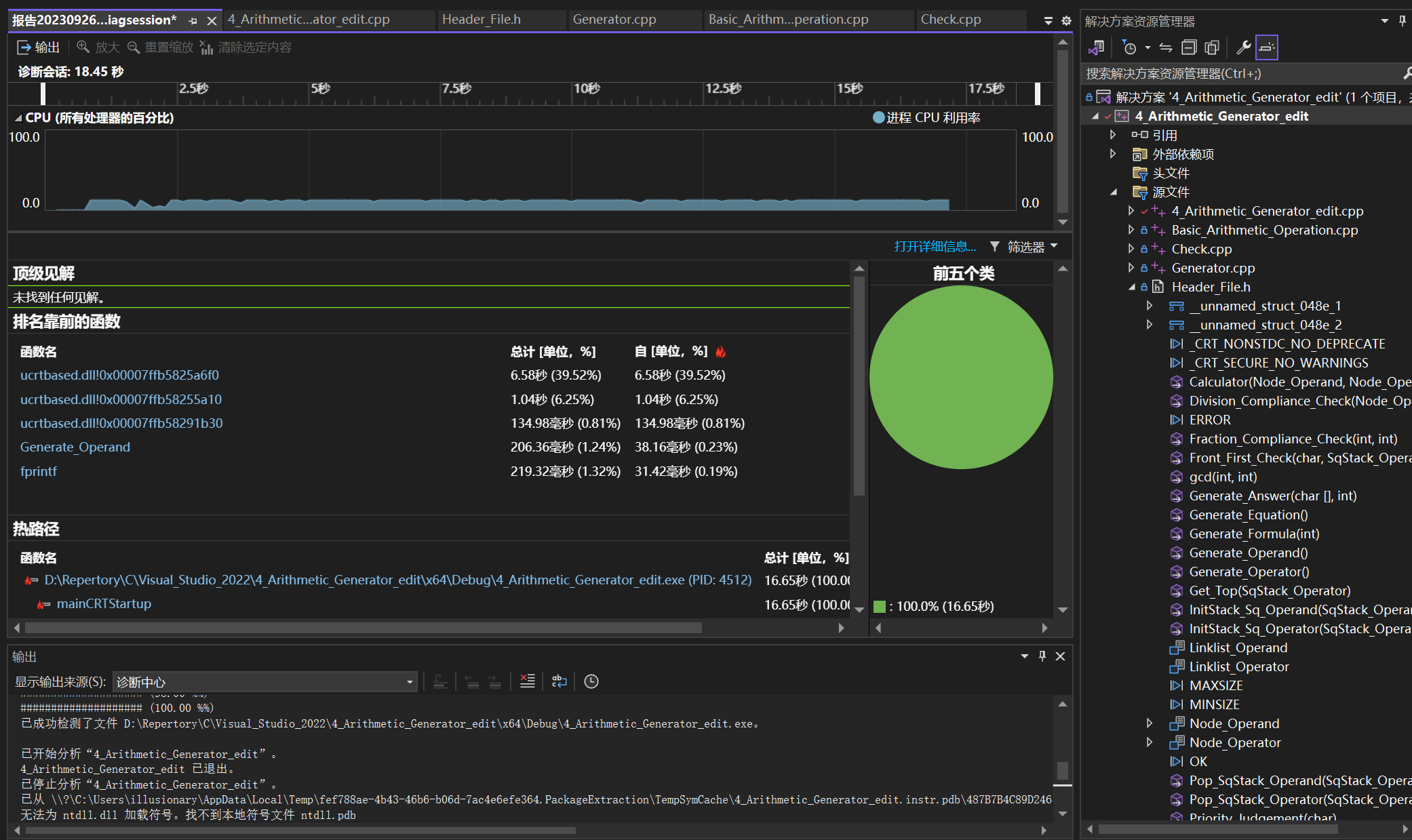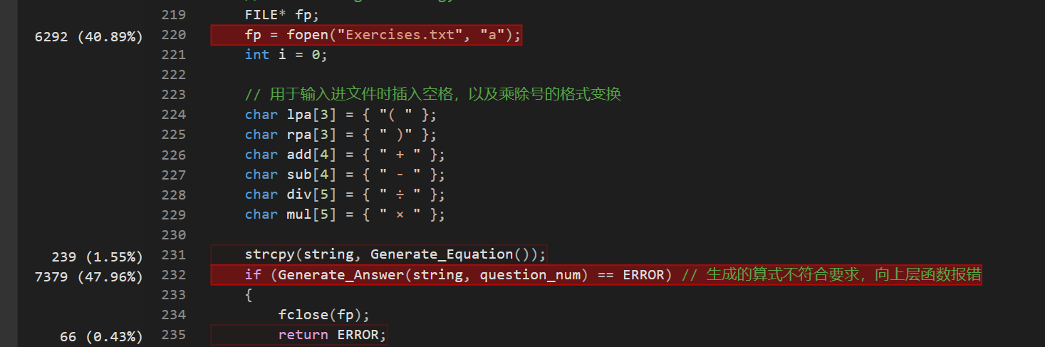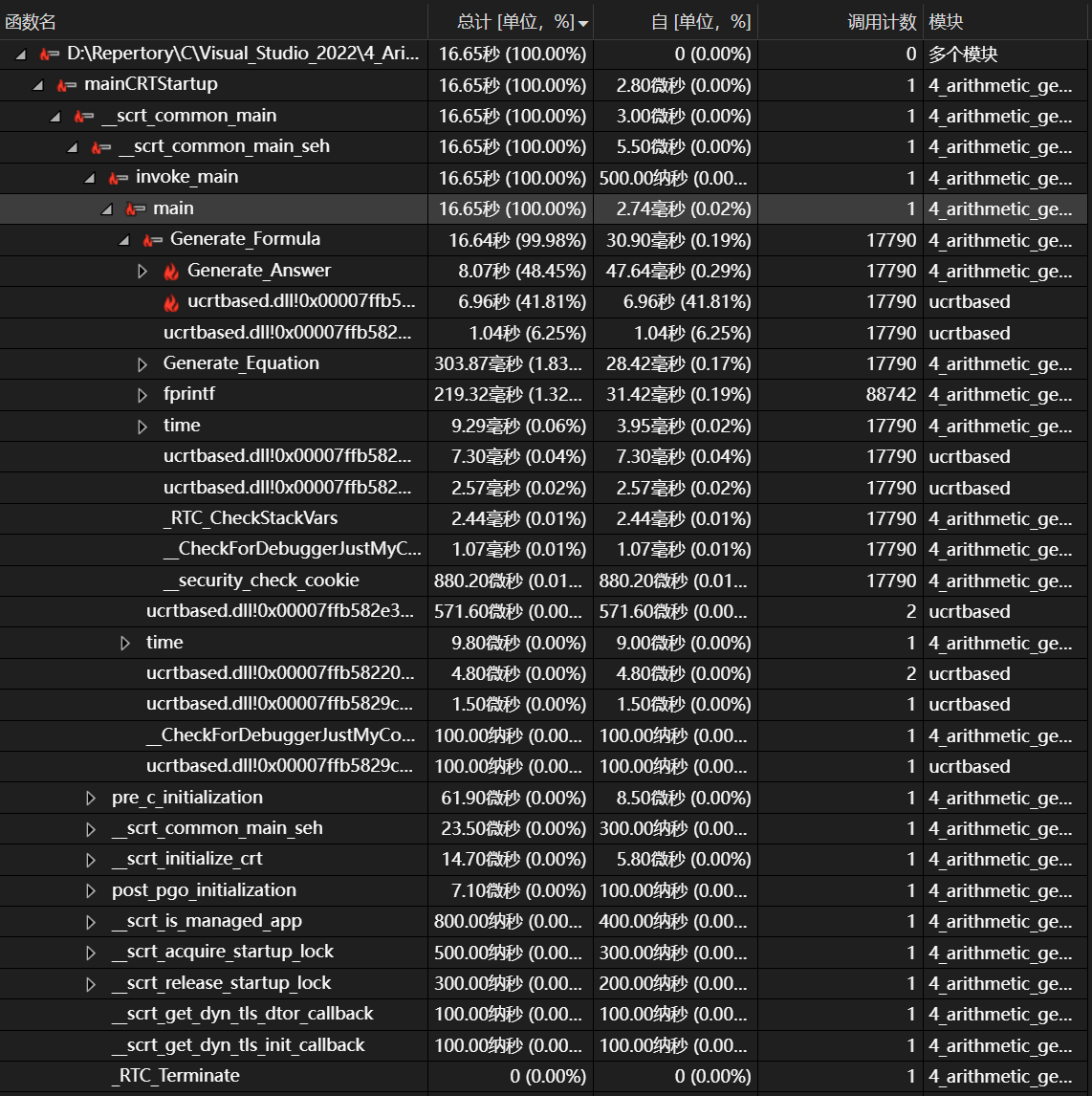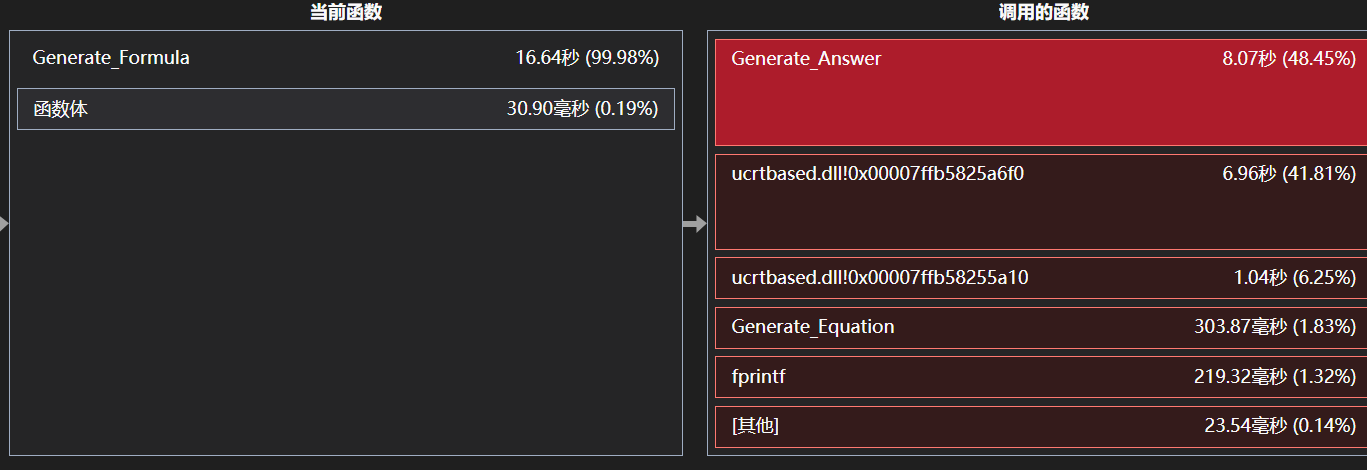 而Generate_Answer函数之所以被调用多次,是因为生成的大多数算式不符合题目要求,导致需要重新生成大量新算式。因此生成算式的逻辑有较大提升空间。