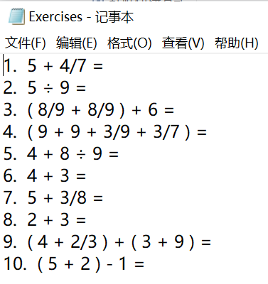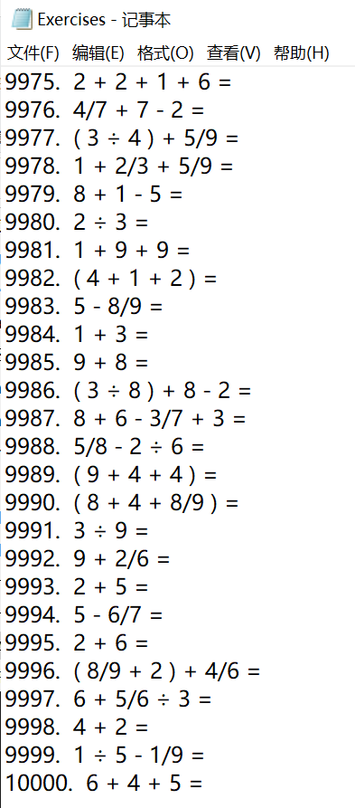 - 程序一次运行生成的题目不能重复,即任何两道题目不能通过有限次交换+和×左右的算术表达式变换为同一道题目,生成的题目存入执行程序的当前目录下的Exercises.txt文件