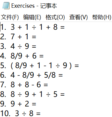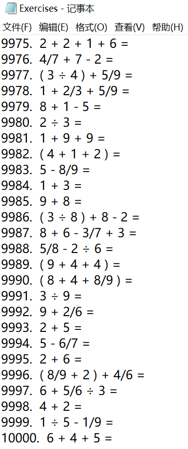 - 程序一次运行生成的题目不能重复,即任何两道题目不能通过有限次交换+和×左右的算术表达式变换为同一道题目,生成的题目存入执行程序的当前目录下的Exercises.txt文件