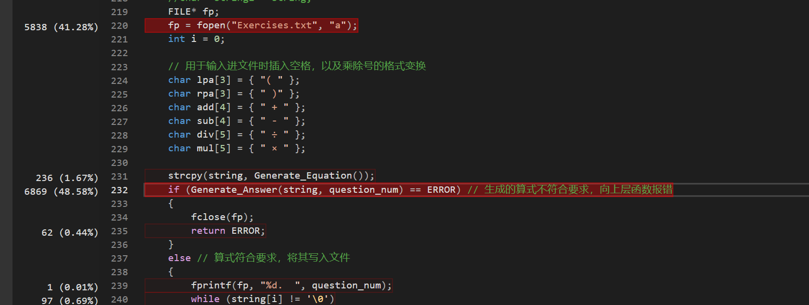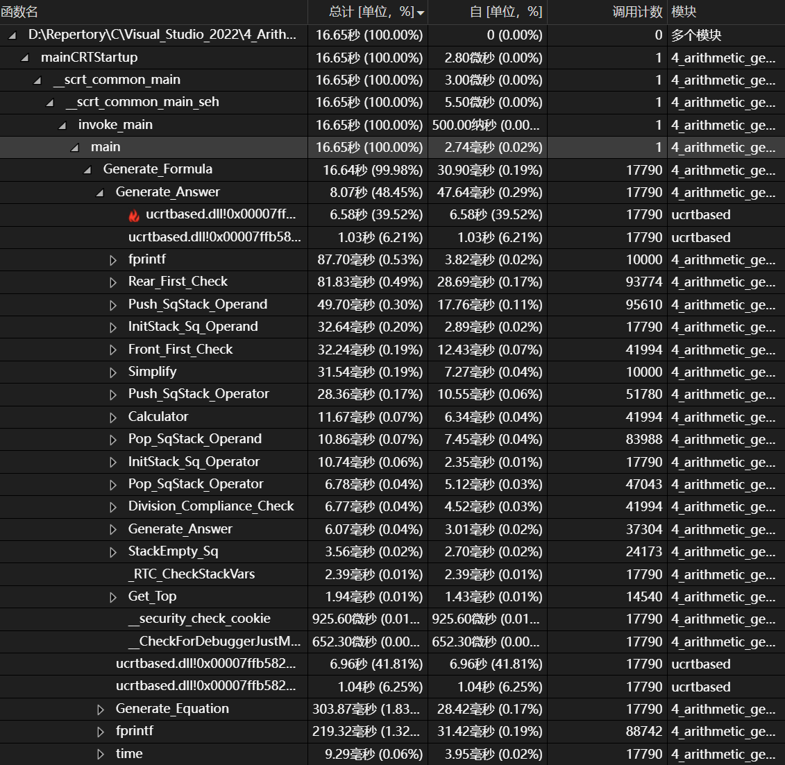 而Generate_Formula函数之所以被频繁调用,是因为生成的算式中,仍有一部分不符合题目要求,导致需要重新生成,故算式生成逻辑仍有优化空间