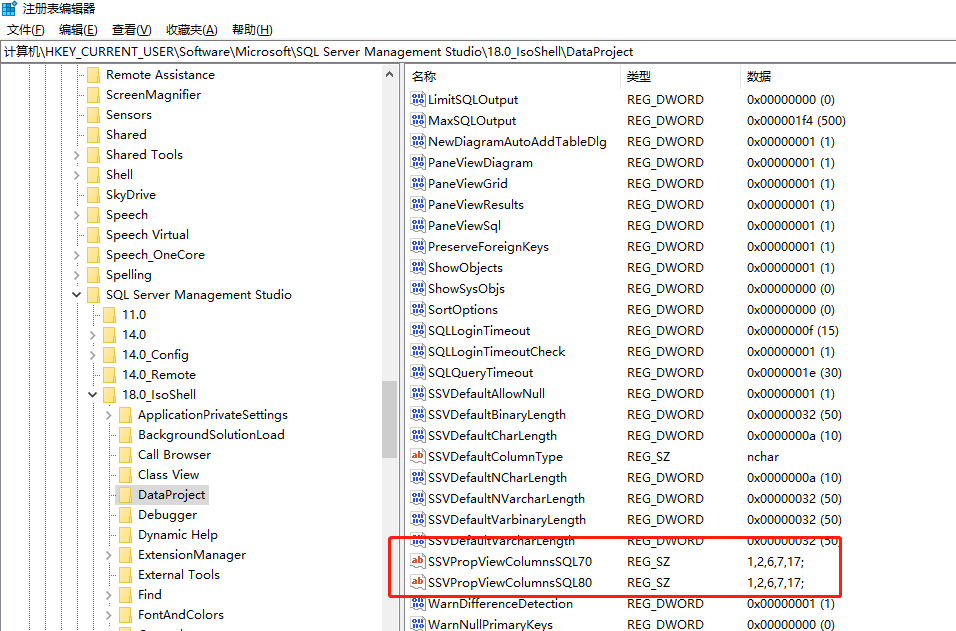 如(18.X 版本)\HKEY_CURRENT_USER\Software\Microsoft\SQL Server Management Studio\18.0_IsoShell\DataProject