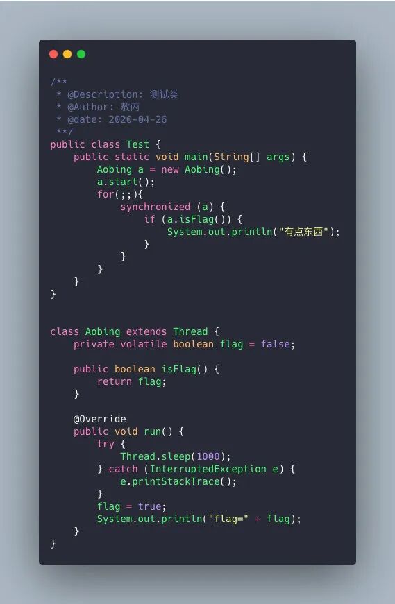 你会发现,永远都不会输出有点东西这一段代码,按道理线程改了flag变量,主线程也能访问到的呀?