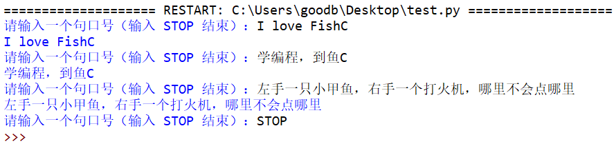 while True: n = input("请输入一句口号(输入STOP结束):") if n == "STOP": break print(n)