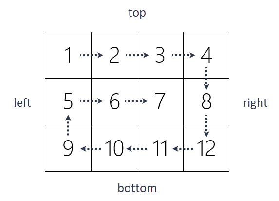 - 先从左往右遍历,依次是 (top, left) 到 (top, right)