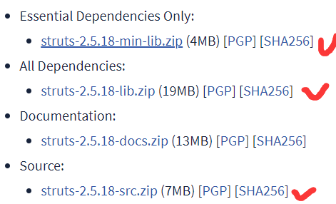 https://struts.apache.org/这是官网,点击下面图示的按钮,下载红色勾的部分(别问为什么,我只会带你脱坑)