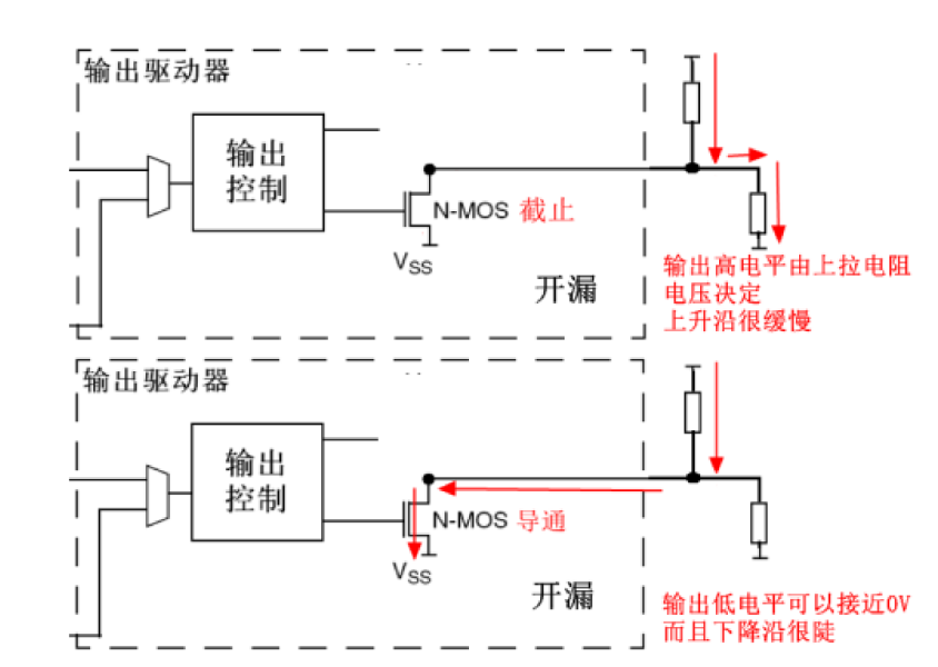 开漏端相当于MOS 管的漏极(三极管的集电极),要得到高电平状态必须外接上拉电阻才行,因此输出高电平的驱动能力完全由外接上拉电阻决定,但是其输出低电平的驱动能力很强。