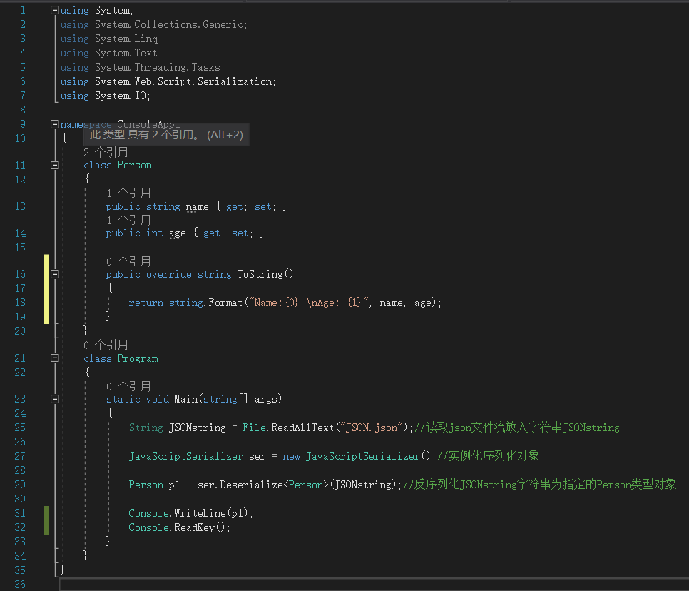 class Person { public string name { get; set; } public int age { get; set; } public override string ToString() { return string.Format("Name:{0} \nAge: {1}", name, age); } } class Program { static void Main(string[] args) { String JSONstring = File.ReadAllText("JSON.json");//读取json文件流放入字符串JSONstring JavaScriptSerializer ser = new JavaScriptSerializer();//实例化序列化对象 Person p1 = ser.Deserialize<Person>(JSONstring);//反序列化JSONstring字符串为指定的Person类型对象 Console.WriteLine(p1); Console.ReadKey(); } }