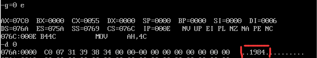 - 9-12行:data段地址赋值到ds,1984(07c0h)赋值给x,str的偏移量赋值给di