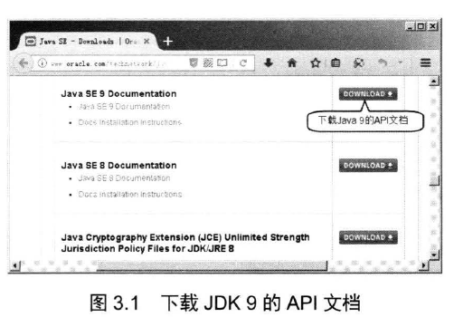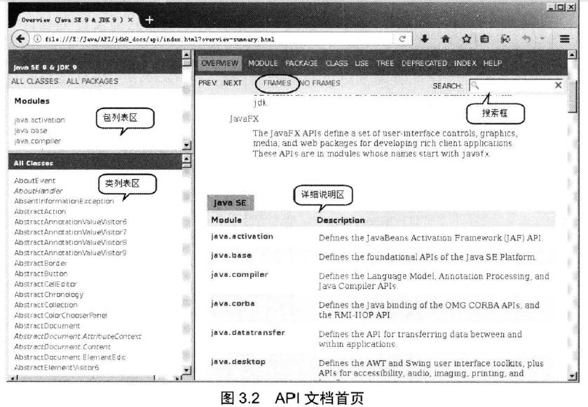 Java 9 对API 文档进行了增强, Java 9 为API 文档增加了一个搜索框,如图3.2 中右上角所示,用户可以通过该搜索框快速查找指定的Java 类。