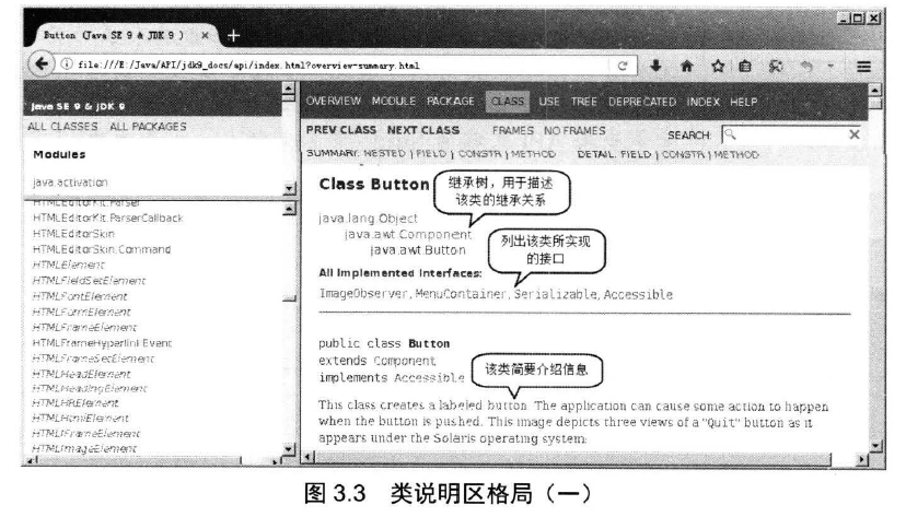 从图3.2 所示的首页中可以看出, API 文档页面被分为三个部分,左上角部分是API 文档"包列表区",在该区域内可以查看Java 类的所有包 ; 左下角是API文挡的"类列表区",用于查看Java 的所有类;右边页面是"详细说明区",默认显示的是各包空间的说明信息。