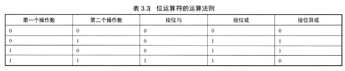 一般来说,位运算符只能操作整数类型的变量或值。位运算符的运算法则如表3. 3 所示。表3.3